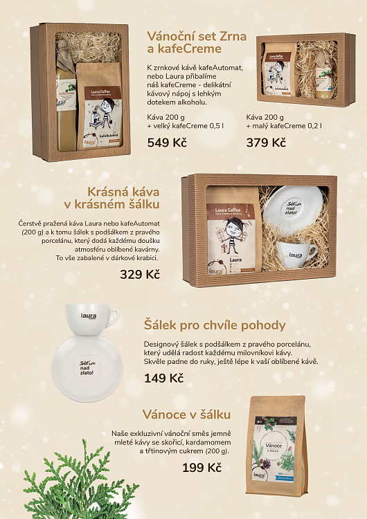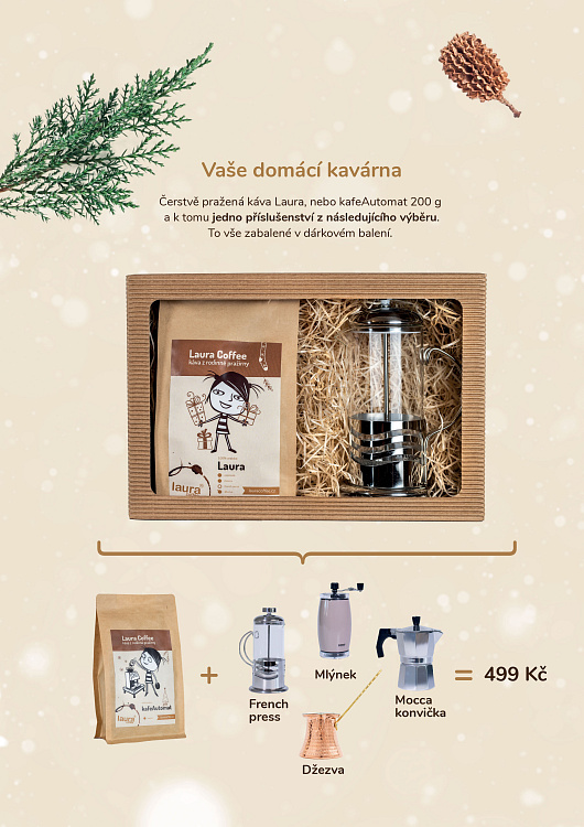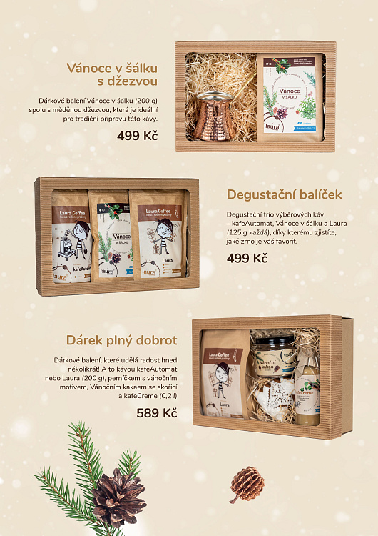 Nejvoňavější a nejkávovější vánoční dárky vám letos rádi zařídíme my, Laura Coffee. Čerstvě upraženou 100% Arabiku s plnou chutí hořké čokolády, lískového oříšku a dochutí kakaa si můžete vybrat v různých variantách i kombinacích.